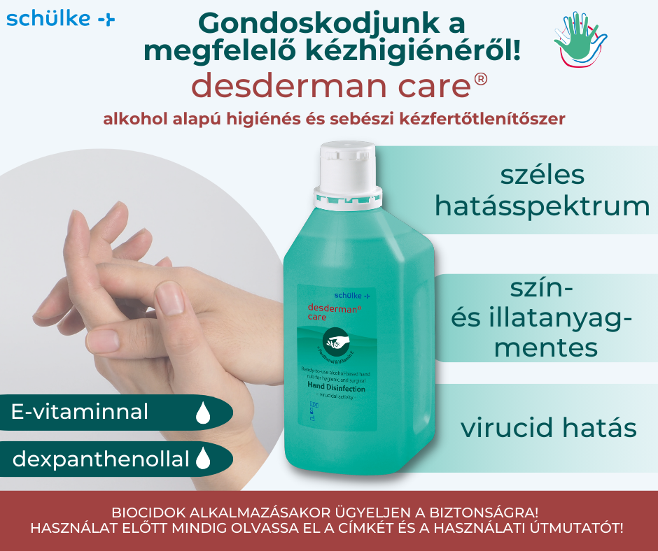 A kézhigiéne megteremtéséhez ajánljuk a desderman® care-t, amely felhasználásra kész alkohol alapú higiénés és sebészi kézfertőtlenítőszer dexpanthenol és E-vitamin ápolóanyagokkal.